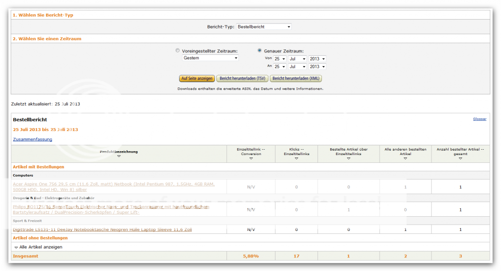 Zur Abwechselung heute mal wider Erwarten kein Monats- oder Wochen-, sondern ein erster kleiner Tagesbericht. Nicht, dass mein netter Blog noch verwaist! So habe ich am gestrigen 25. Juli 2013 insgesamt drei Produkte verkauft bzw. über Amazon zum Kauf vermittelt.