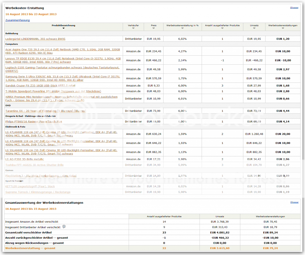 Jetzt wie üblich direkt zum nächsten Thema dieses Beitrags: zur Werbekostenerstattung, die mir in der dritten August-Woche 2013 (16. bis 23. August) durch Amazon gutgeschrieben wurde – wie Sie ja als treuer Leser bereits wissen, versteht man unter besagter „Werbekostenerstattung“ meinen Verdienst bzw. meine Umsätze.