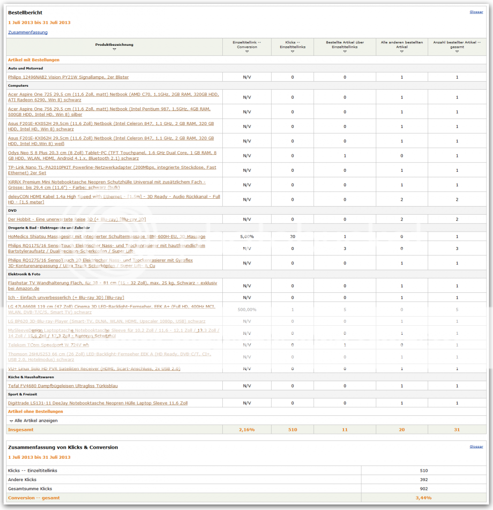 Die sogenannte „Conversion Rate“ lag im Juli bei 3,44 % – das bedeutet: Durch 902 Klicks auf meine Partner-Links wurden die oben erwähnten 31 Produkte vermittelt bzw. verkauft.