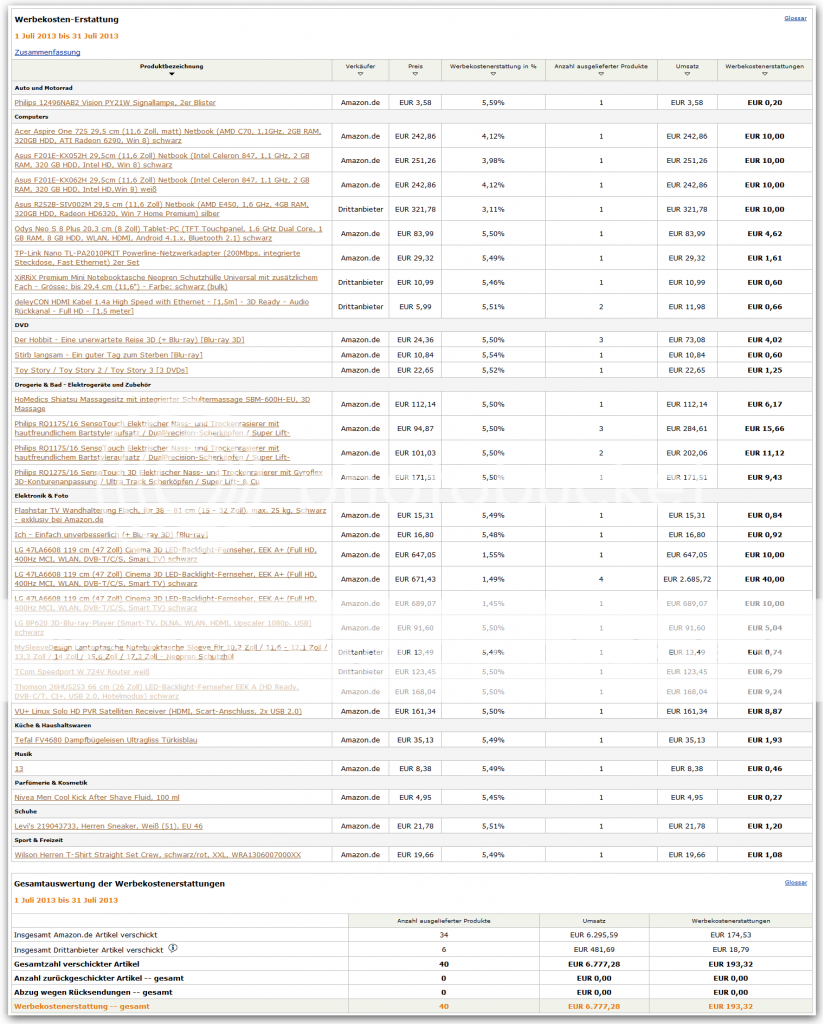 Die Werbekostenerstattung, die mir Amazon für den vergangenen Monat Juli 2013 gutschreiben wird, beträgt exakt satte 193,32 Euro. In dieser Summe enthalten sind natürlich auch wieder ein paar Produkte, die ich bereits Ende Juni vermittelt hatte, die aber erst im Folgemonat Juli ausgeliefert wurden. So ist das logischerweise in jedem Monat.